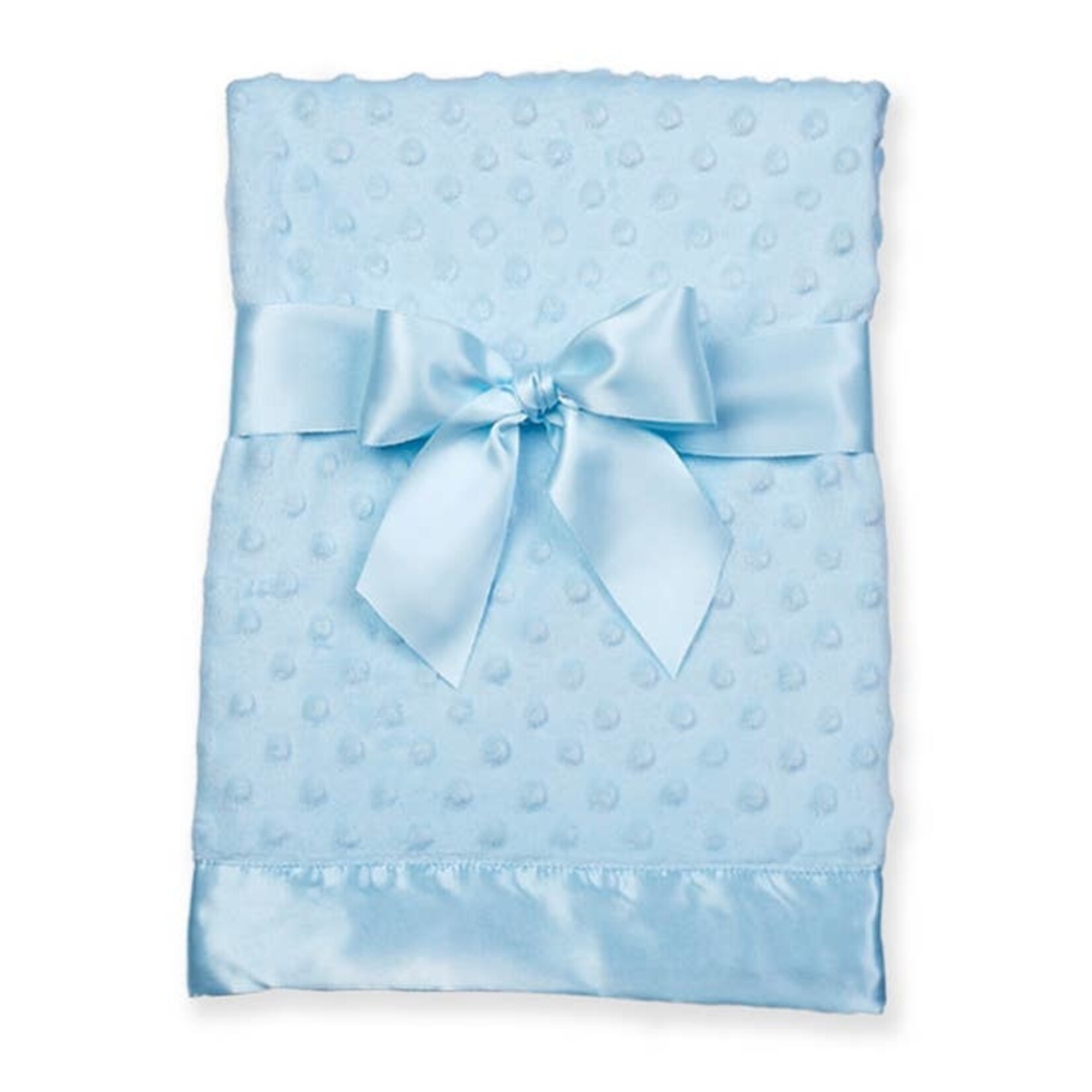 Blue blanket with textured dots and satin edge.